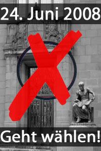 Wie bereits im letzten Jahr gibt es auch dieses Jahr wieder eine StudiVZ-Gruppe zur Uniwahl. Diese findet am 24. Juni 2008 statt. In der Gruppe geht es weniger um Wahlkampf als um Informationen zur Wahl (Wer wählt wen warum woraus?) und um Wahlwerbung in der Hinsicht, daß überhaupt hingegangen wird.