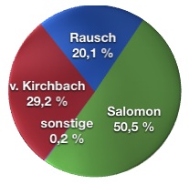 Ein erster Blick in die Wahlbezirke zeigt, daß die Polarisierung hauptsächlich zwischen Rausch und Salomon stattfand: Rausch fuhr sein bestes Ergebnis mit 40,9% in der (ehemaligen? vermeintlichen? wahren?) Grünenhochburg Vauban ein, gefolgt von der stadtbaubedingten WiM-Hochburg Weingarten mit 39,4%. Hier holte Salomon mit 26,3% sein mit Abstand schlechtestes Ergebnis. Das Vauban landet bei ihm mit 37,8% auf dem viertschlechtesten Platz. Dramatisch punkten konnte der Amtsinhaber vor allem in den traditionell eher konservativen Randgemeinden. Ob Waltershofen, Kappel oder beliebige Tuniberggemeinden: 60%+x waren hier die Regel. Ebenfalls buchstäblich ins Schwarze traf Salomon in etlichen Bezirken in Herdern, St. Georgen, Zähringen oder Günterstal. Die Einzelergebnisse des zweitplatzierten Dritten im Bunde, Sozialbürgermeister Ulrich von Kirchbach (SPD), sind genauso unauffällig wie der Kandidat und sein Wahlkampf selbst.