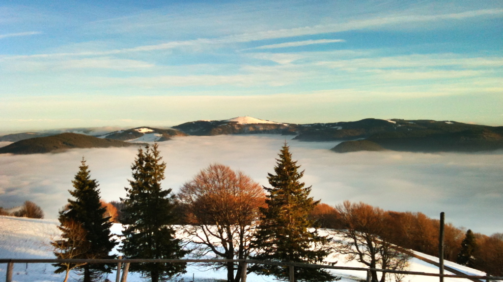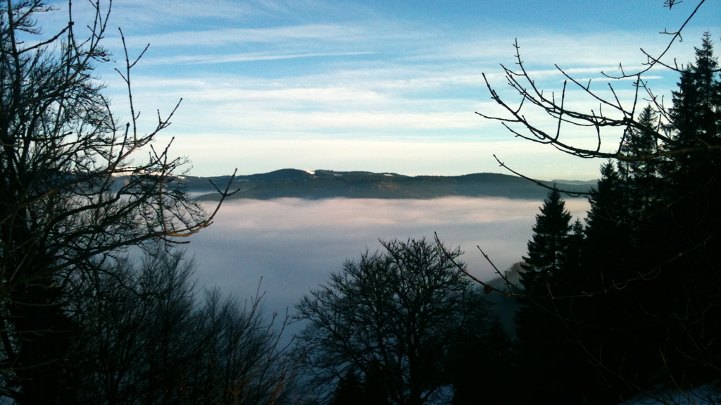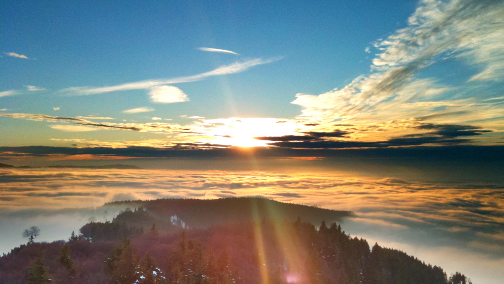 Und: über Freiburg. Die Stadt lag nämlich heute nicht komplett unter einer Wolkendecke. Der Schauinsland samt dazugehörigem Turm hat oben rausgeguckt. Und ich auch. Das sah dann so aus: