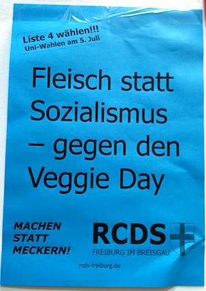 Mit „Fleisch statt Sozialismus“ sorgen die christdemokratisch geringelten Studenten gewiß abermals für einen Dauerbrenner in Sachen Hochschulpolitikhumor, der moderne Klassiker wie „Kooperation statt Konfrontation“ bei weitem übertreffen dürfte. Der sich durch den gesamten RCDS-Wahlkampf ziehende Claim „machen statt meckern“ wirkt im Zusammenhang mit dem Kampf gegen die drohende Zwangsvegetarisierung übrigens besonders amüsant.